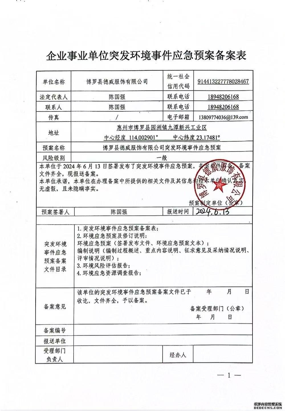 附件鏈接:《博羅縣德威服飾有限公司突發(fā)環(huán)境事件應(yīng)急預(yù)案?jìng)浒傅怯洷怼?/strong>