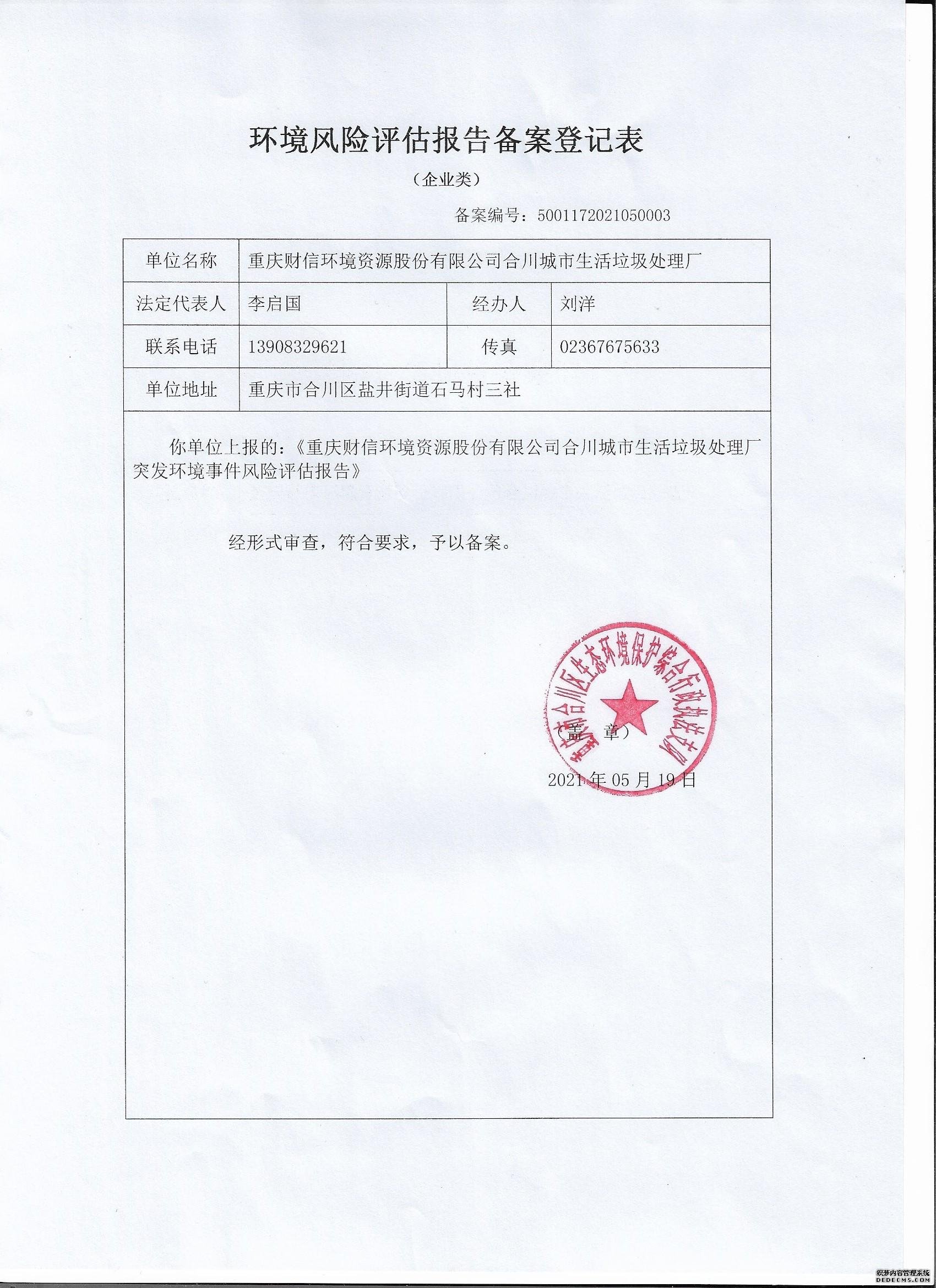 已制訂《重慶財(cái)信環(huán)境資源股份有限公司合川城市生活垃圾處理廠環(huán)境風(fēng)險(xiǎn)評(píng)估》,并于2021年 5月20日在合川區(qū)環(huán)境保護(hù)局備案, 備案編號(hào):5001172021050003 |